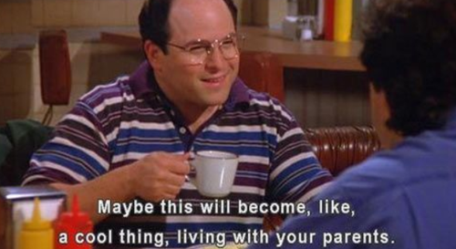 Ah, the flip side. Alongside the joys of Charmin and a fully-stocked fridge, we have some downsides here. Turns out, you can’t use your bedroom floor as a closet or throw your beer on the floor when you’re done drinking it. You have to dump out your cereal bowl when you’re done with it. And sometimes your parents invite all their friends over and you have to explain to 20 (well-meaning) old people what you’re doing with your life and why you’re living at home. And of course, there’s the constant FOMO as you sit home on a Saturday night watching National Treasure while your friends send snapchats all of their awesome shenanigans.