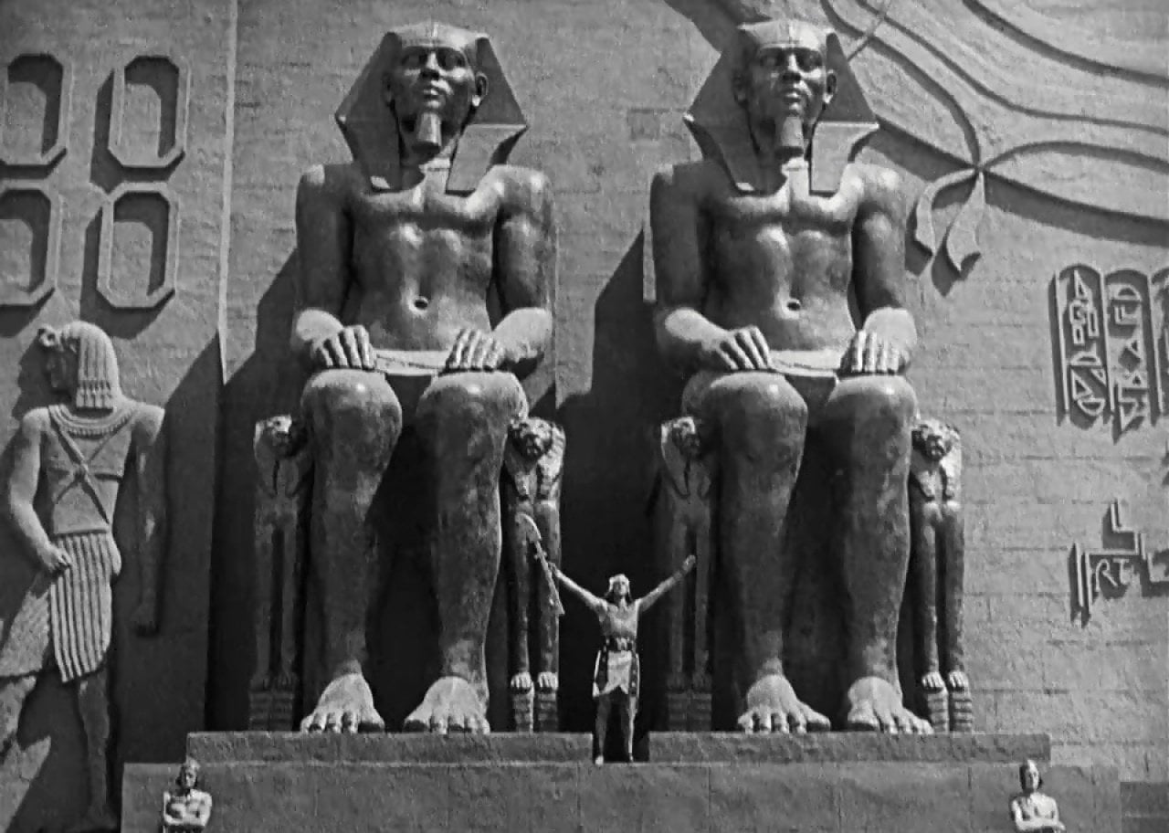 Cecil DeMille’s biblical film “The Ten Commandments” unfolds in two different parts. The first retells the story of Exodus, while the second takes place in the present and features two brothers arguing over their interpretations of the Ten Commandments. The movie is part of an unofficial religious film trilogy that includes DeMille’s 1927 movie “The King of Kings” and his 1932 movie “The Sign of the Cross.”