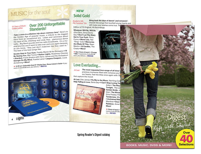 Spring Direct mail Catalog for Reader's Digest, Music, books, Videos, and other products.