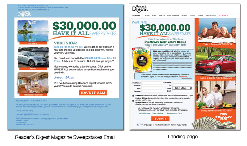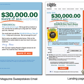 Email and Landing page for a $30,000.00 Sweepstakes and magazine Subscription offer. I created both the email and landing page, and also wrote the copy for all headlines.