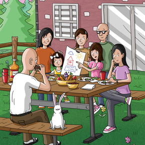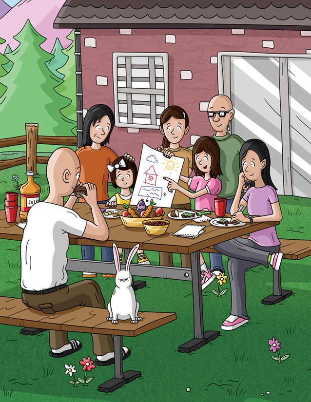 This is the last page of "Careful Construction", a book I illustrated for the AppleTree Institute. The book is about two sisters who build a house from the ground up with their uncle, and in this final scene, they've decided on some additions of their own!