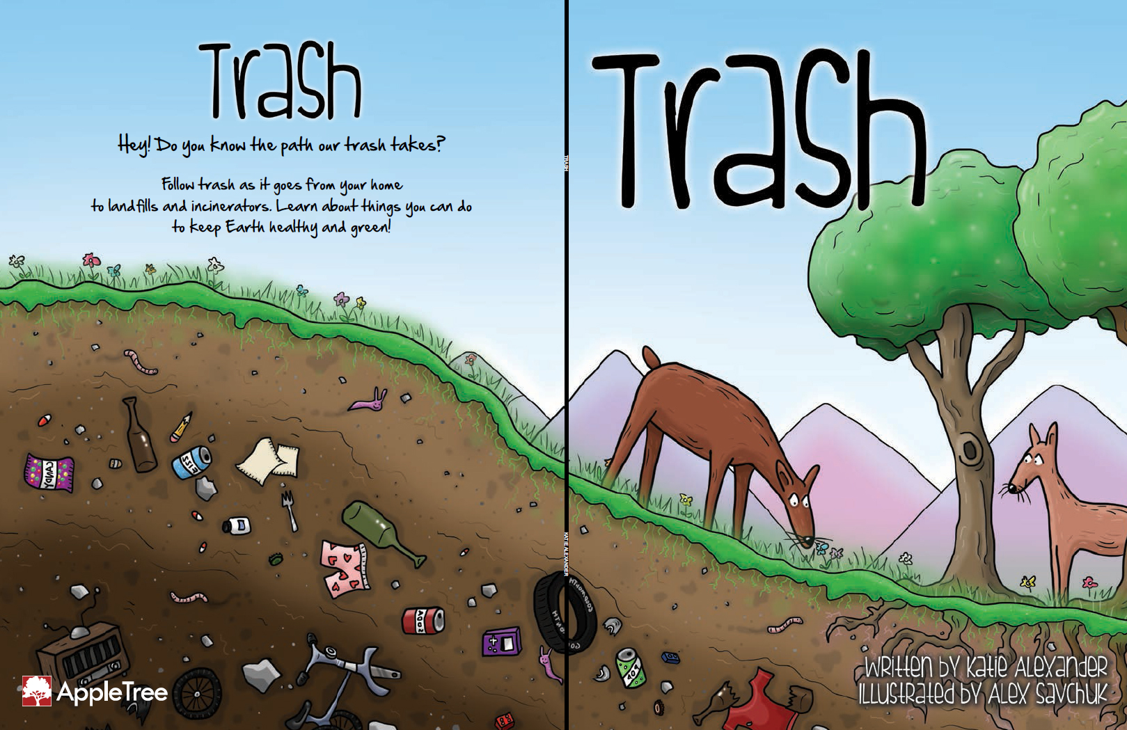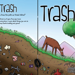 This is the front / back cover spread for the book "Trash", a book I illustrated for the AppleTree Institute that teaches kids that their trash doesn't simply disappear once they toss it into the bin.