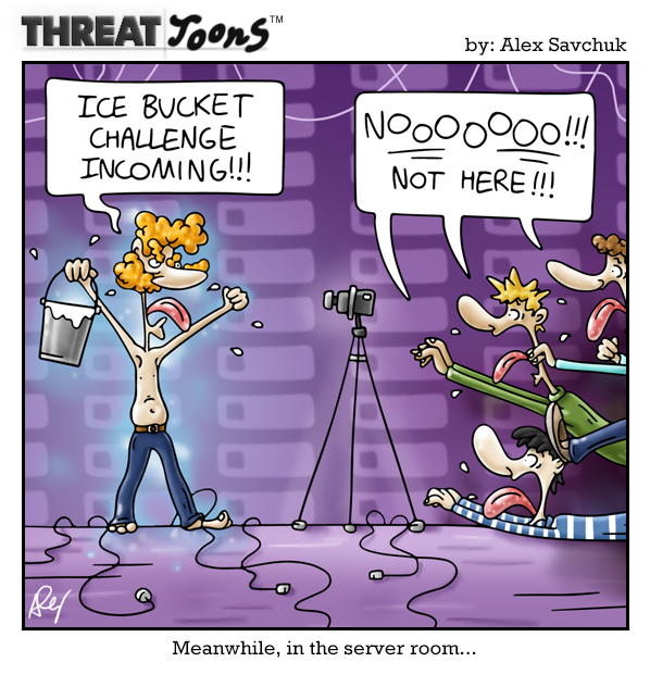 A ThreatToon incorporating the ALS Ice Bucket Challenge. An overexcited employee is about to pour water all over himself in the server room.