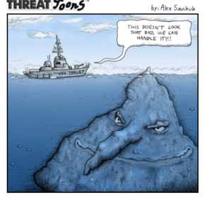 A toon for the cybersecurity blog "Threat Geek" depicting threats being perceived as minute by only seeing the "tip of the iceberg".