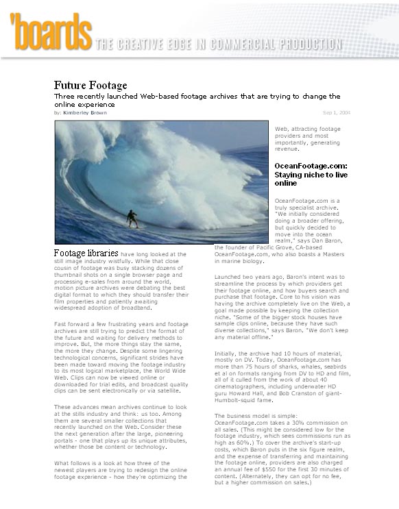 A great feature achieved for leading stock footage provider OceanFootage, in leading trade magazine 'boards -- exactly where they wanted to be.