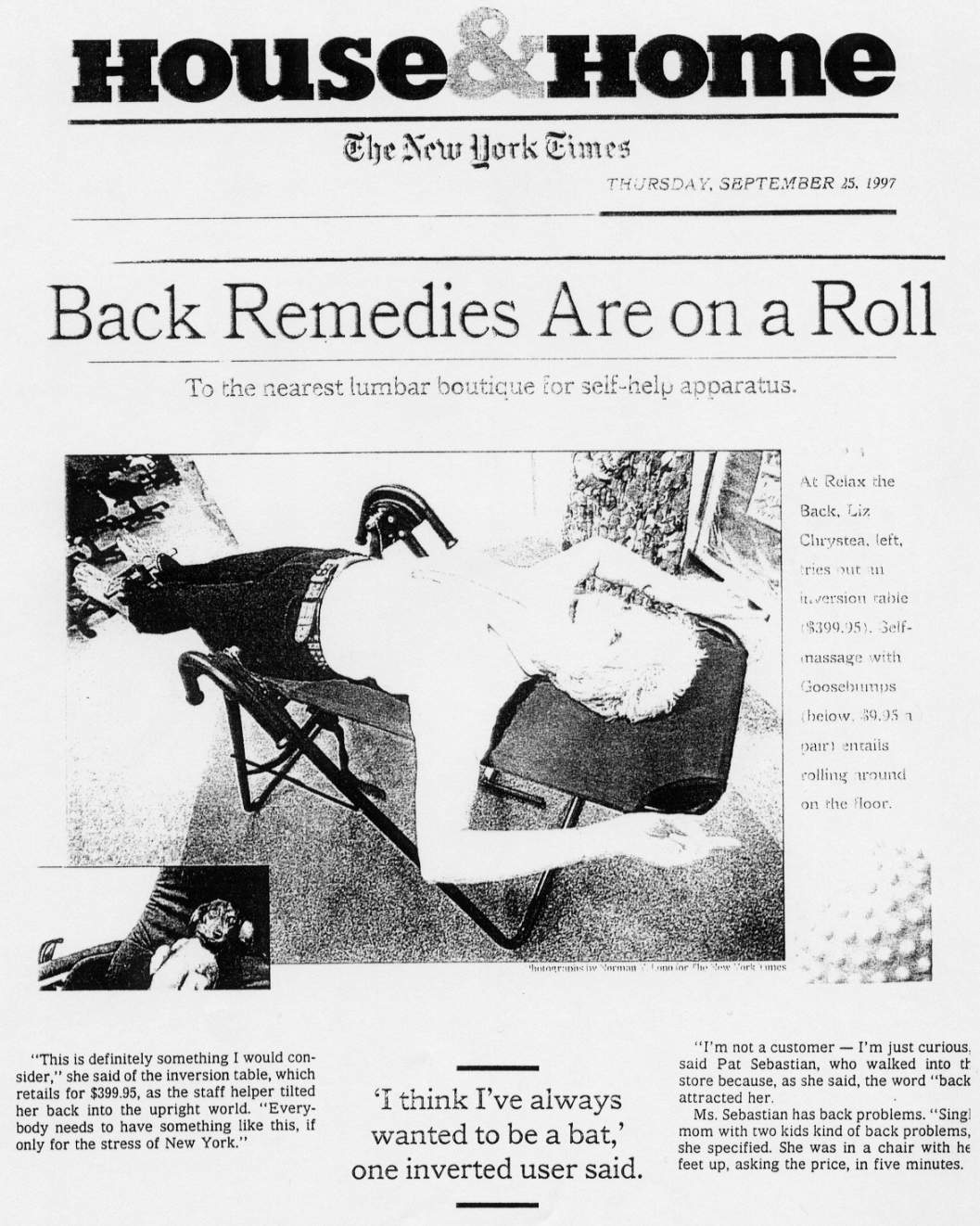 A great example of what pitching the press can achieve, with this feature in The New York Times spotlighting Teeter Hang Ups and their inversion therapy products.