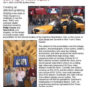 Here's a great example of press achieved by a simple and aggressive PR campaign on behalf of creative wizard Philip Owens and Space Virus. His Quiksilver display in Times Square was impossible to miss -- and I was able to get him press to match!
