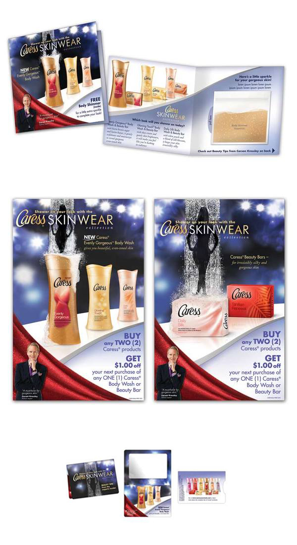 I leveraged the 2009 national look and feel to create shopper marketing collateral featuring Carson Kressley. I designed two easel back counter cards, a brochure with a body shimmer sample, and a mirror take-home gift.