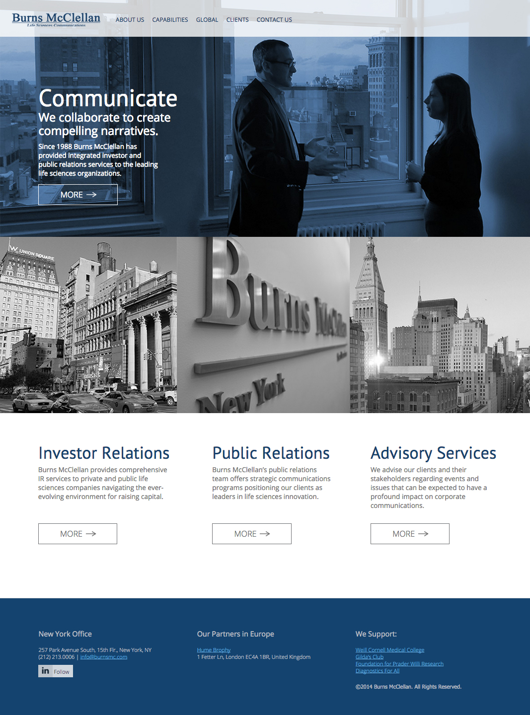 My team and I designed and developed a new, completely custom WordPress website for Burns McClellan, one of the leading life sciences PR and IR firms in NYC. I created a design that was in line with the company’s corporate nature and clientele, but that also had style by pairing black and white NYC imagery with a blue and gray color scheme and modern fonts. We also built a site that is user-friendly when viewed from any type of device – mobile, tablet or desktop.