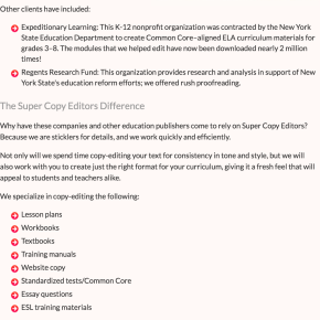 "I love working with you. Fast, efficient, and deadly with a red pen. We’re totally thrilled with all that you do to help us." —Ron Evans, founder, Groupofminds >>> "This is exactly the editing service I was looking for. Not always easy to find through Google." —David Nelson, marketing manager, Clark Howes Group >>> "We have been blown away by how good the team as Super Copy Editors is at improving our writing. They catch the typos that no one else saw, in addition to making brilliant suggestions for clarity of ideas. We highly recommend working with Super Copy Editors!" —Caitlin Rogers, Productions Director, Next Day Animations