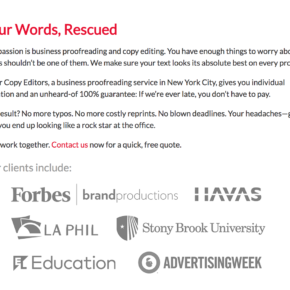 Forbes (10+), Type Directors Club (10+), The Nation magazine (10+), The New York Times (10+), The Times-Picayune (New Orleans) (10+), Dishing Magazine (10+), Freelance New York City copy editor (10+), LA Philharmonic (10+), Life Refined (10+), NYC proofreader (10+), Petful.com (10+), Big Pharma (10+), Warner Bros. Television (10+), The University of Chicago (10+), Stony Brook University (10+)