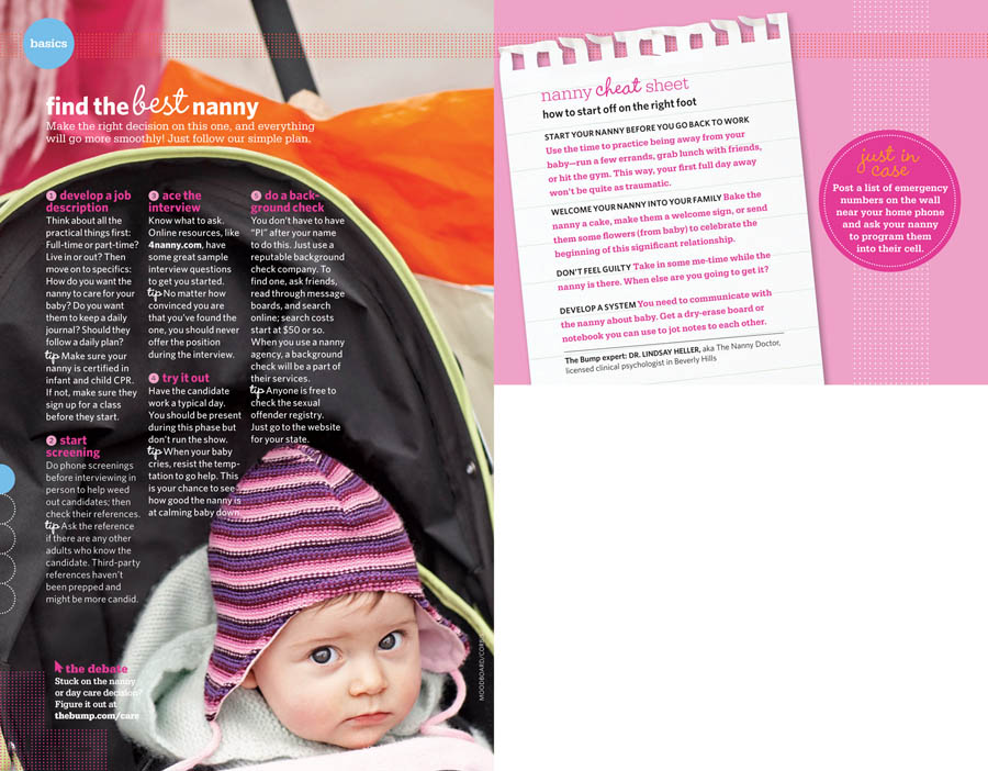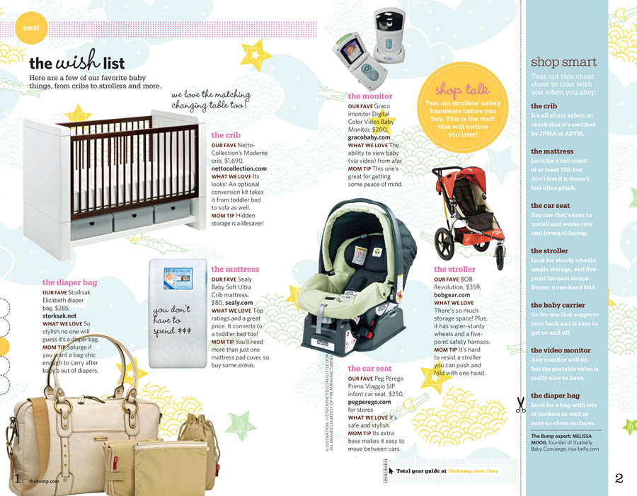 Instead of arranging a bunch of random products across the spread, I found and manipulated a pretty, modern looking background that was in keeping with The Bump brand look, and at the same time anchoring the floating objects.