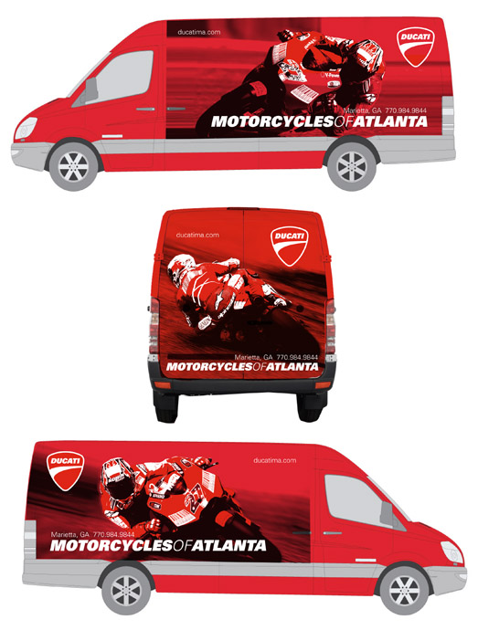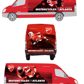 I gave this retail sprinter wrap the characteristic sexy Ducati look using photoshop manipulated images of Ducati's World Champion racer Casey Stoner. Each side of the sprinter shows a different image of Stoner at relatively the same lean angle, so that as you pass the sprinter on the road, you can see different views of the same maneuver.