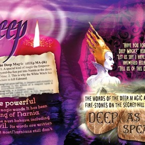 Spread for the book "Step Into Narnia: A Journey Through The Lion, The Witch, and The Wardrobe". Disney provided images of character prototypes used for the motion picture "Narnia". It was then up to me to create backgrounds and typography unique to each spread.