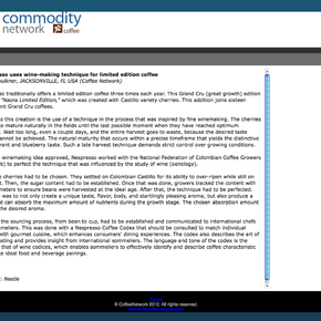 Proprietary online trade journal: Feature about unique coffee-making technique created by Nespresso (Nestle) and National Federation of Colombian Coffee Growers/Fedecafe. Coverage on new Nespresso limited edition coffee.