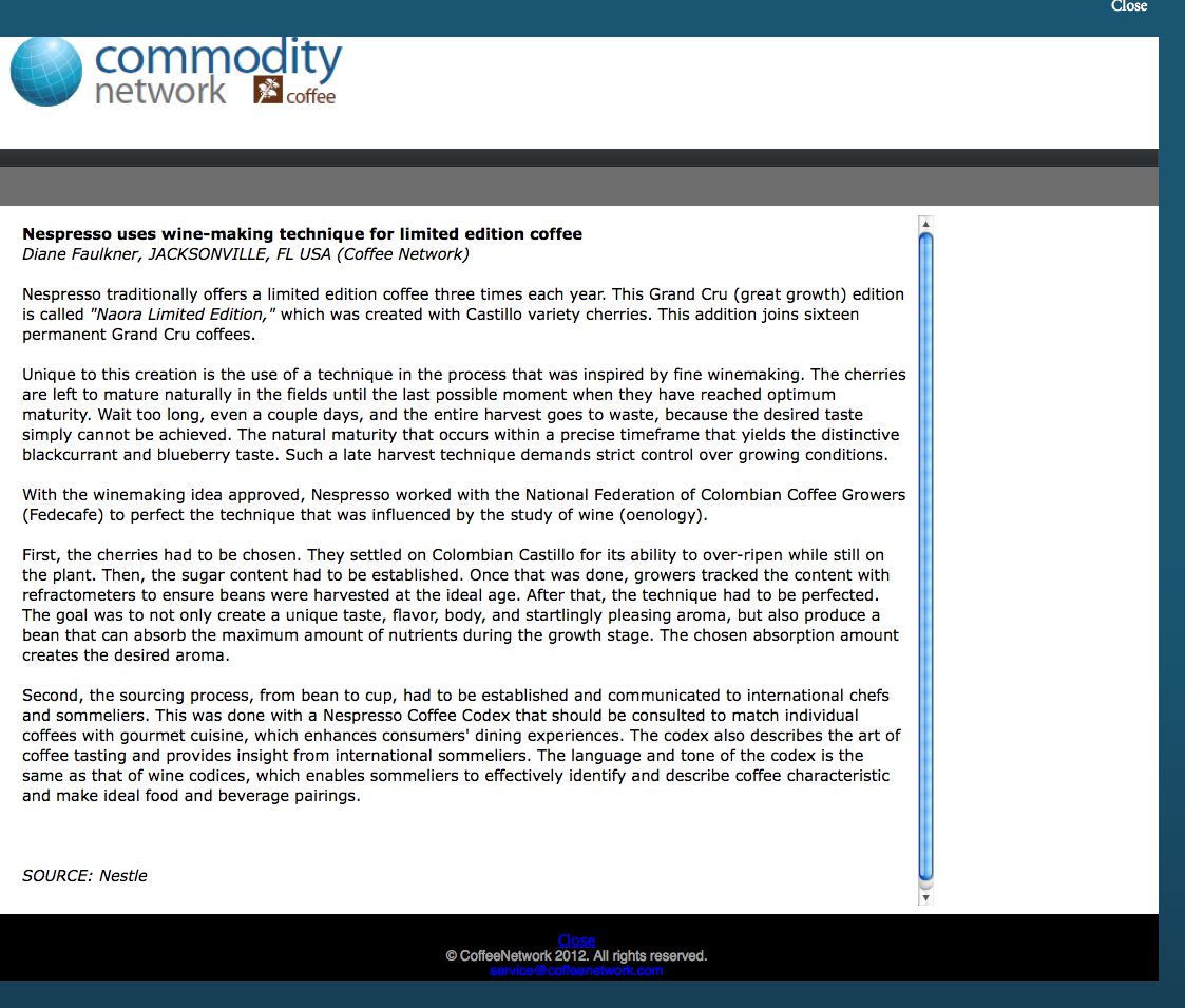 Proprietary online trade journal: Feature about unique coffee-making technique created by Nespresso (Nestle) and National Federation of Colombian Coffee Growers/Fedecafe. Coverage on new Nespresso limited edition coffee.