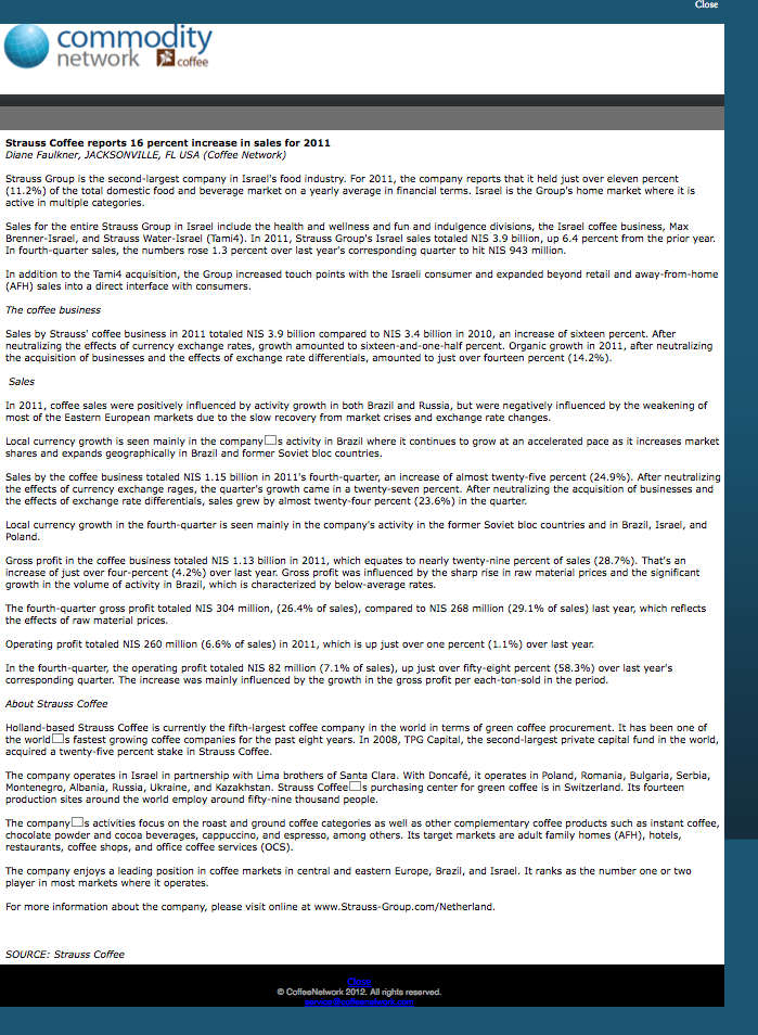 Proprietary online trade journal: Coverage of Strauss Coffee's 2011 earnings results.