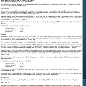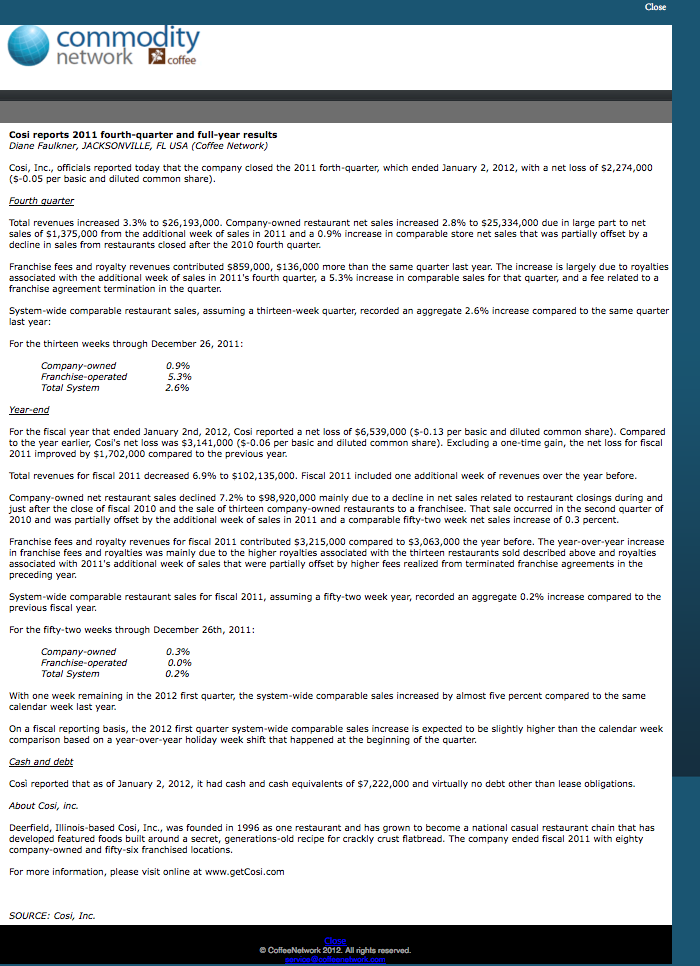 Proprietary online trade journal: Report on Cosi, Inc.'s 2011 fourth-quarter and full-year fiscal earnings.