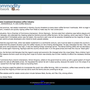 Proprietary online trade journal: Coverage of Central Kenya coffee farmers' progress in stopping government sanctioned small-holder coffee farm, coffee plantation and estate land confiscation by developers.