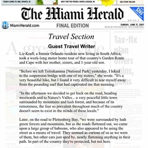Liz Kraft, a former Orlando resident now living in South Africa, took a week-long motor home tour of that country's Garden Route and Cape with her mother, sisters, and 1-year-old son... ...Read more about her adventures in South Africa online at www.miamiherald.com/travel. Click on "Guest Travel Writer" and "TravelingMom".