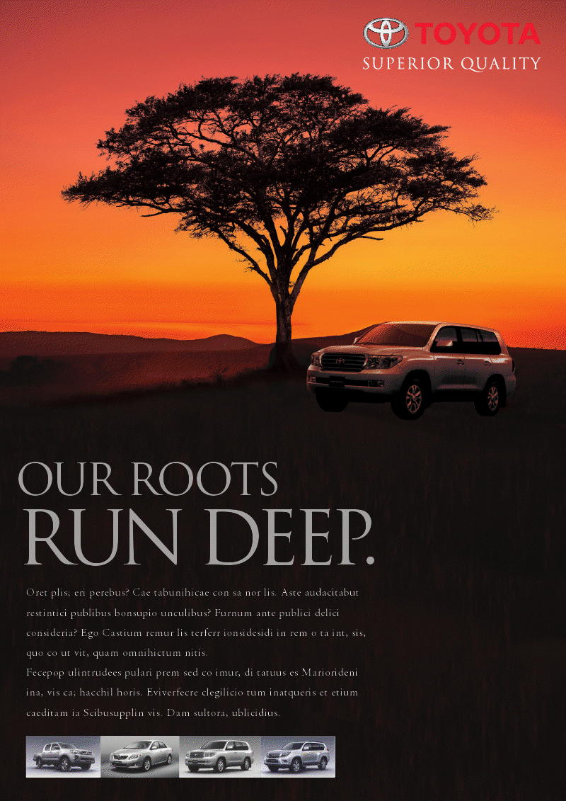 Worked with c.2k's multi-lingual creative team to develop strategy and copy platforms for Toyota Global campaigns in markets including Africa, China, Mexico and Europe. Wrote headlines, taglines and scripts for :30 spots. Highlights: "The Art of Power" :30 spot and "Our Roots Run Deep" billboard campaign for Toyota Africa.