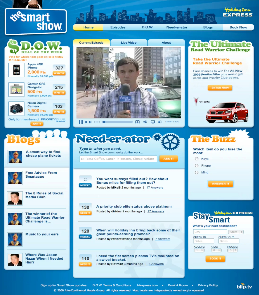 THE CONCEPT: A daily interactive web series and companion destination site hosted by a comedic male-female duo who travel across the U.S. staying only in Holiday Inn Express hotels - gathering surprising and fun tips from viewers, hotel staff tied to the theme of "What's so smart about America." Portal destination included a booking engine.