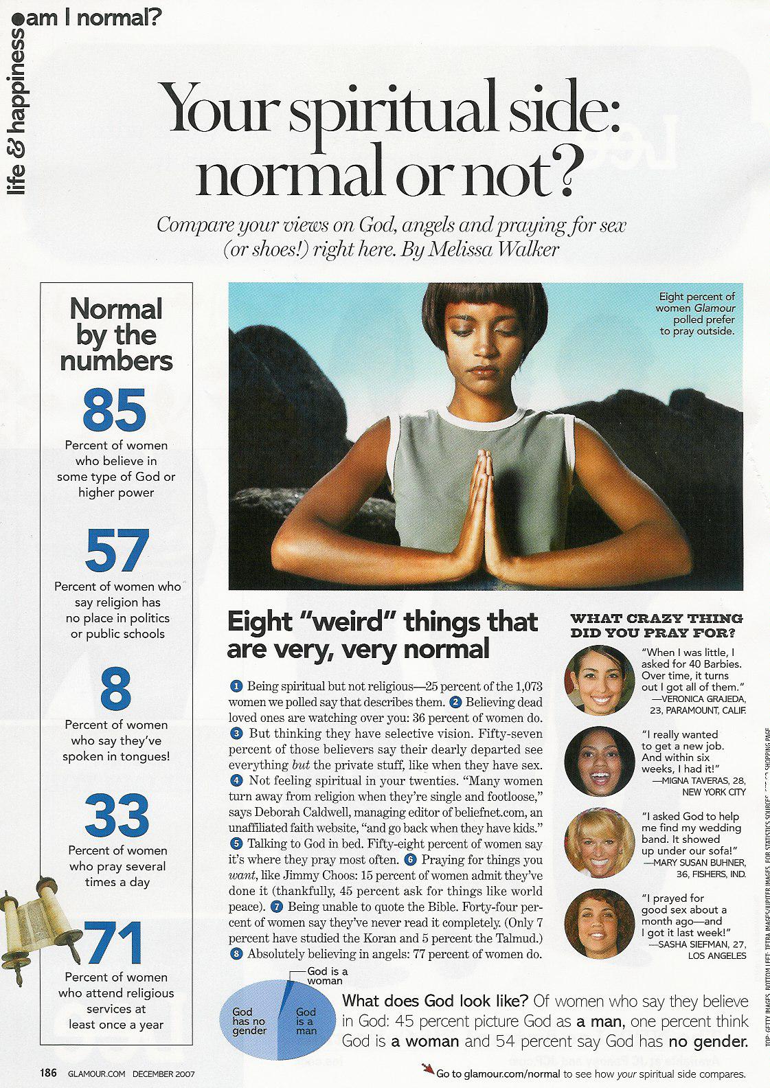 Compare your views on God, Angels and praying for sex (or shoes!) right here.