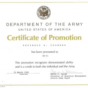 US Army Management Analyst, Sierra Army Depot, Herlong, CA 96113, Certificate of Promotion G-11.