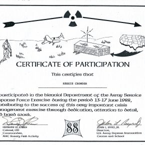 Department of the Army Certificate of Participation for "contributing to the success of this very important crisis management exercise through dedication, attention to detail and hard work."