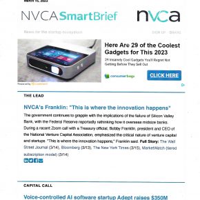 REG CROWDER: Writer and researcher 2014 to present, "NVCA SmartBrief," an e-newsletter published by SmartBrief in partnership with the National Venture Capital Association.