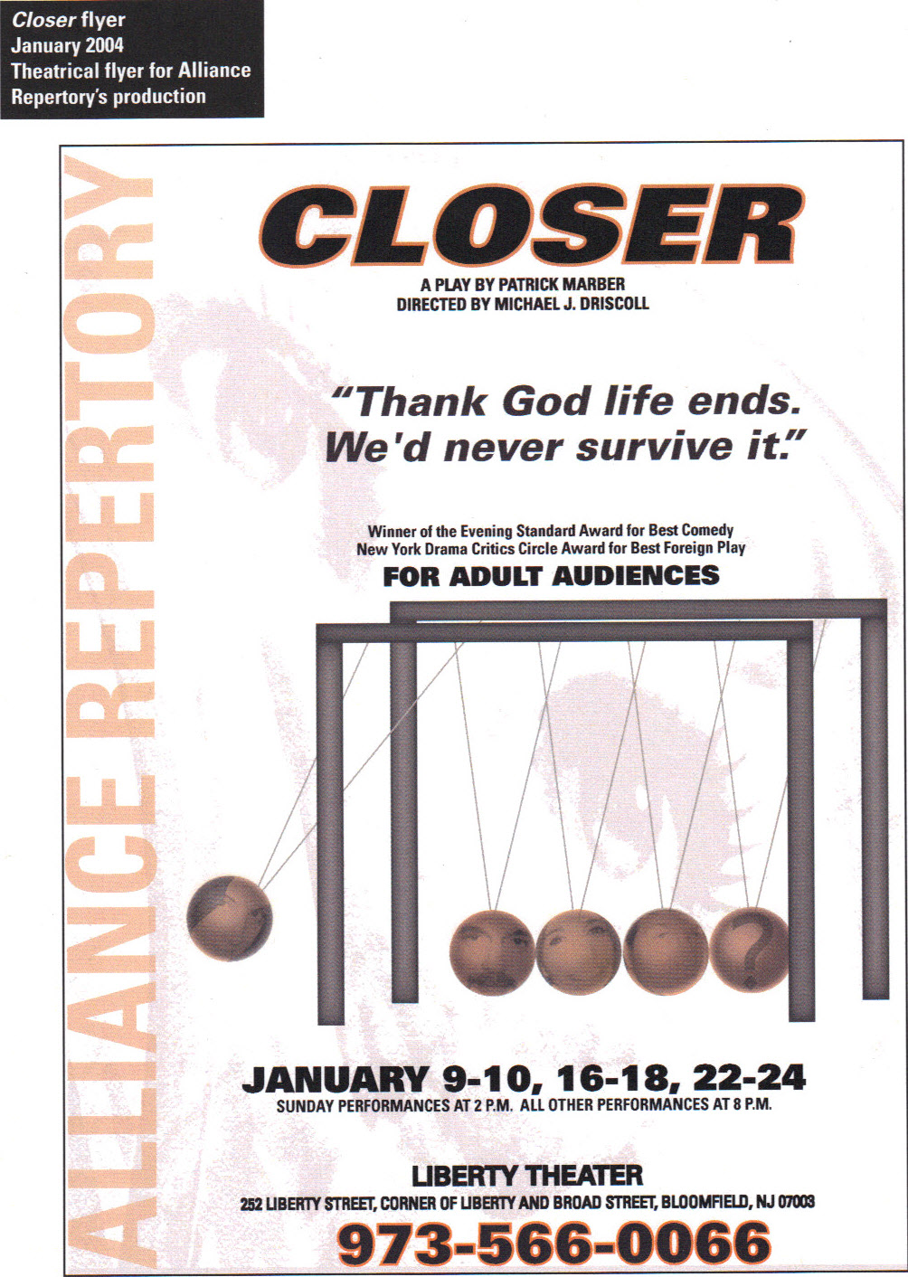 Poster for production of "Closer," quoting a line from the show. The image of a Newton's Cradle is also a reference to a line in the play; the actors' ghostly faces are imposed onto the metal balls to represent the characters' inescapable effects on each others' lives.