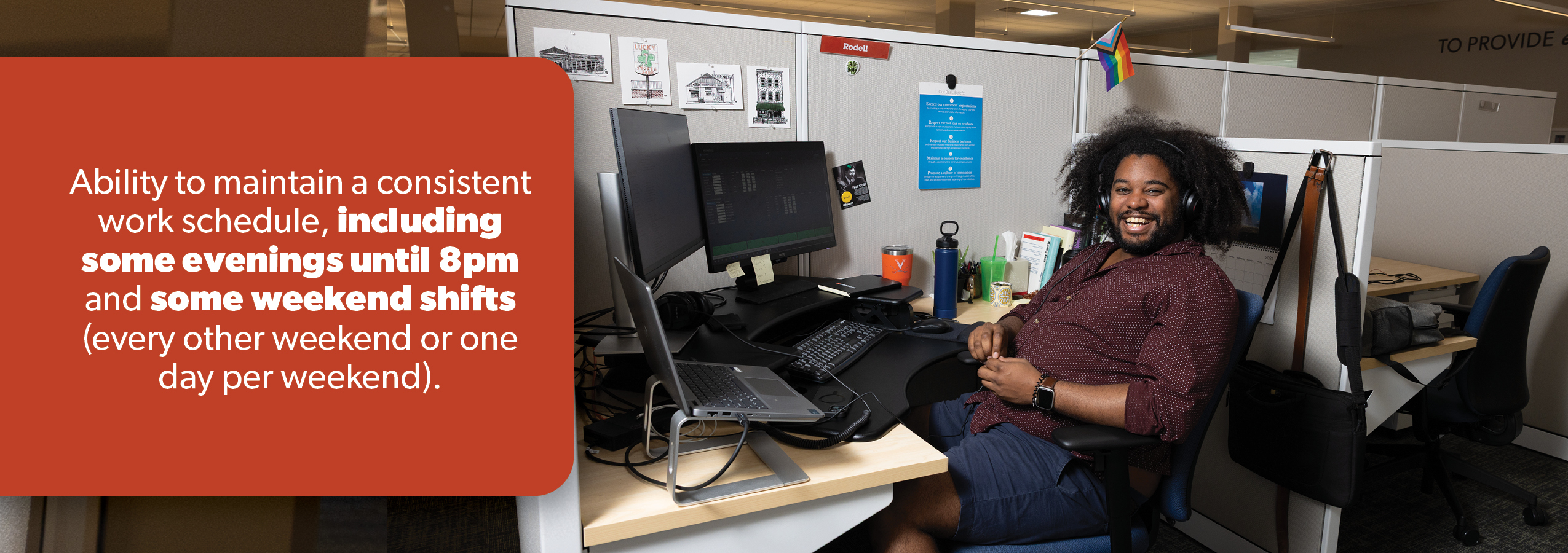- Ability to work a consistent schedule that includes some evening shifts (up to 8 PM) and some weekend shifts (every other weekend or one day per weekend)